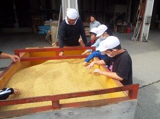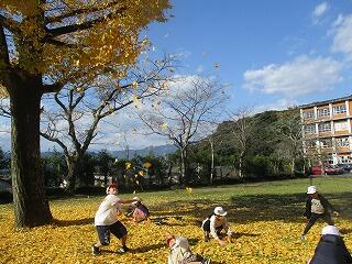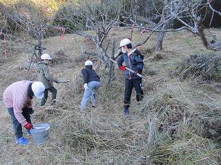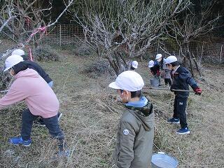 今日、全校で梅の寒肥やりを行いました。梅の木の根元のワラを取り除き、肥料をかけてやりました。グループに分かれ、肥料をあげた木には黄色いスズランテープを付けながら作業しました。