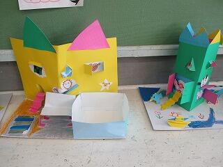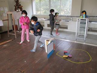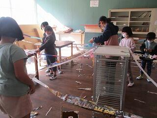 1・2年生が図工室でゲームセンターを開きました。17日(金)の休み時間には3・4年生を、今日の昼休みには5・6年生を招待して自分達が作った遊び道具で遊んでもらいました。
