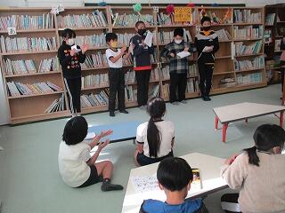 2日(木)、6日(月)の昼休み、図書委員会が図書祭りを開きました。2日には「対抗しりとり遊び」を通して、言葉に関心をもってもらう取組を行いました。