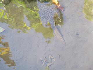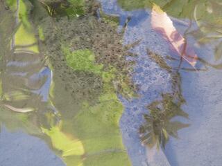 ビオトープの池を見ると、寒い中、もうカエルの卵が見られます。横でカエルがじっとしています。