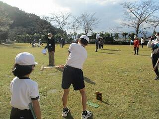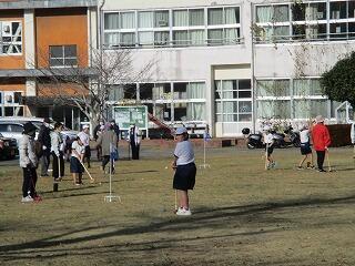 地域の方、保護者の方と児童が混合チームに分かれ、それぞれ8ホールを廻りました。最初はうまく飛ばせなかった低学年の児童も、ホールを廻るごとに上手になっていきました。いろんなチームで、歓声や笑い声が起きていました。交流という目的がしっかり果たせたように思います。ご参加いただきありがとうございました。