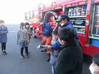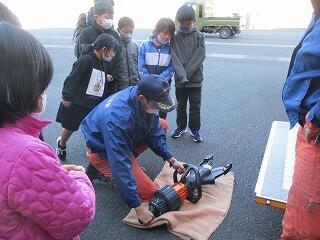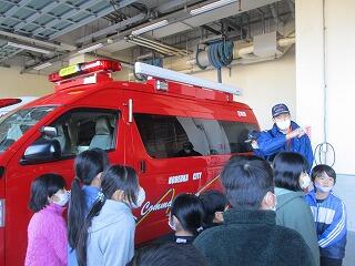 延岡消防署に到着し、今度は消防署の宇和田さん、工藤さんから消防署の業務についてのお話を聞きました。救急車・消防車・救助車・はしご車・支援車等のそれぞれの車の特徴を、実際に乗せていただいたり、用具を持たせてもらったりしながら学ぶことができました。とても詳しく説明していただきました。