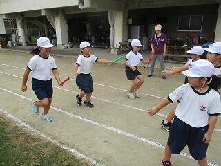 昨日の昼休みはちょっとムシッとしていましたが、1・2年生が元気に運動場に出てきました。そして、自分達でリレーを始めました。担任の先生も加わって、みんなで走っていました。