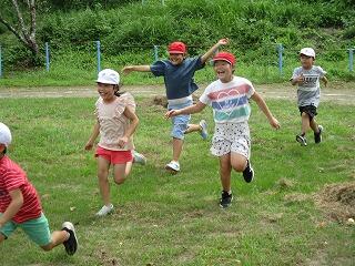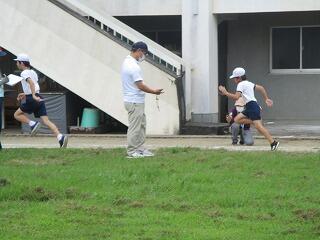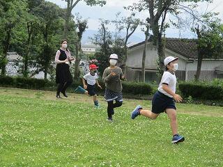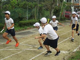昨日の昼休みはちょっとムシッとしていましたが、1・2年生が元気に運動場に出てきました。そして、自分達でリレーを始めました。担任の先生も加わって、みんなで走っていました。