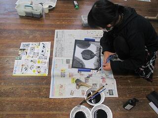 前回、図工で5・6年生は身近な材料を筆に見立てて描く「おもしろ筆」に取り組みましたが、今度は「墨と水から広がる世界」と言う単元で、墨をぼかしながら自由に表現していました。黒一色でも、濃淡でいろいろな表現を楽しんでいました。