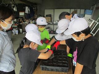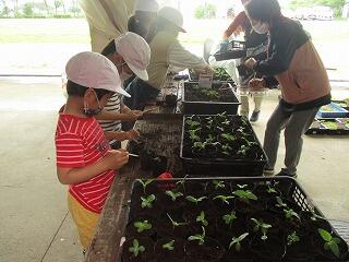 みんなポットの土に穴を開け、優しく植え替えを行っていました。