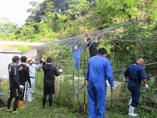 同じく29日(日)結団式に続いてPTA奉仕作業が行われました。児童・職員・保護者の方々それに地域ボランティアの方々も参加してくださり、みんなで作業を行いました。男性保護者は校舎裏の使われていないビニールハウスの撤去作業、児童と女性保護者はグランドの除草作業、ボランティアの方々は草刈り機を使っての除草・選定作業等、それぞれが分担して作業を行いました。