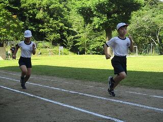 昨日は5月最後の五月晴れで爽やかな一日でした。奉仕作業でスッキリしたグランドで早速全校で50mの記録走を行いました。みんな全力で走りました。