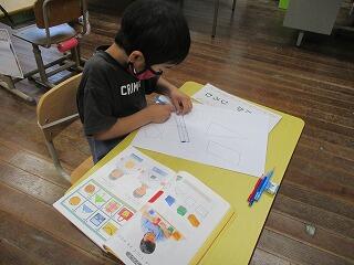 2年生は算数「長さ」で、ものさしを使って㎜を測っていました。パーティションごしに、真剣に相談していました。