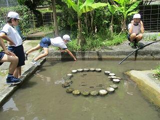 「それが同じところに今日もいるんですよ。」と言うので、先生達が見に行ったところホテイアオイの葉の下にまるで自分の家かのようにちょこんと座っていました。「かわいい!」と先生達が近寄っても、我関せずという風にすましていました。カエルは苦手なのですが、船に乗って揺られているようで確かに雰囲気がかわいいなと思いました。