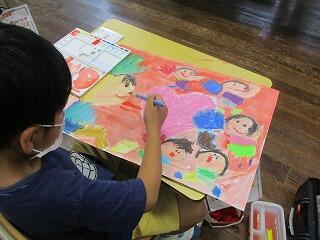今日、1・2年生は、人権週間に関するポスターを描いていました。1・2年生は、ポスターでも字は入れなくてよいそうです。温かい色使いで、友達みんながにこにこしている絵でした。細かいところまで丁寧に塗ろうとしていました。