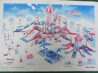 終業式の日に供用開始となる公園。完成予定図を見ると楽しそうです。校区外のため自転車では行けませんが、夏休みにお家の人といっしょにぜひ利用できるといいと思います。