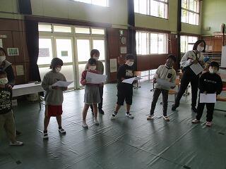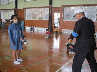 次に全校児童が体育館に集まり、声掛け事案への対応訓練を行いました。6年生の矢野愛実さん・今村莉音さんが声をかけられた時の対応方法を皆の前で演じました。また、6年生の渡邉美羽さんがお礼の言葉を述べました。