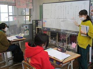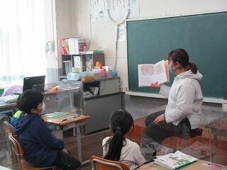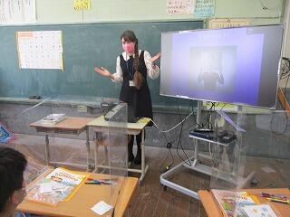 今日、5年生、6年生の外国語科の授業がありました。延岡市ALT(外国語指導助手)のアナ・メイソン先生が来られました。港小学校は本年度が3年目になられます。本年度は東海中学校区を中心に廻られるそうです。