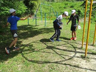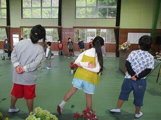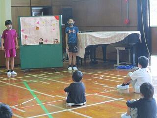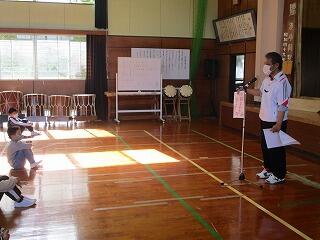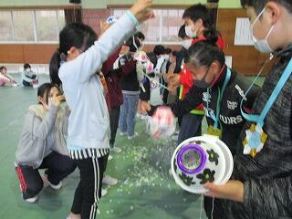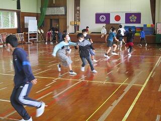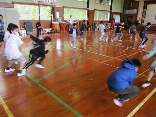 ゲームでは、宝探しゲーム、線オニ(体育館のラインの上だけを走る鬼ごっこ)、ころがしドッジボールを行いました。1年の大夢君も大活躍です。全校みんなで楽しんで行うことができました。