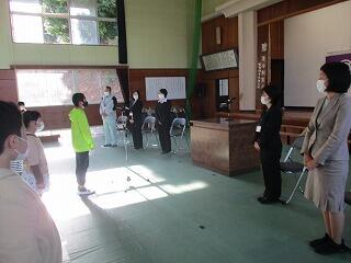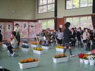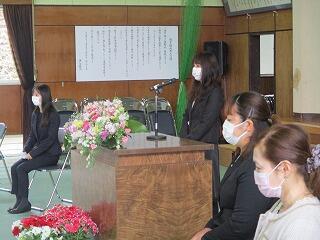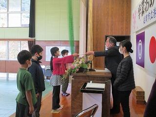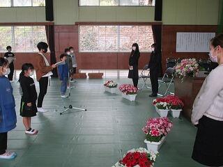 離任式では、退職・転出される先生の紹介後、お一人お一人があいさつを述べられました。児童を代表して卒業生の松本麻央さんがお礼の言葉を述べ、みんなで花束を贈りました。