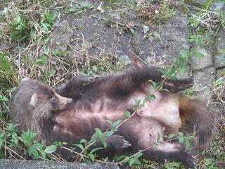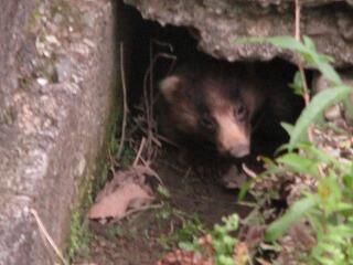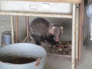 昼休み、渡り廊下を見ると何かモソモソと、のんびり歩いています。ネコかな?タヌキかな?と後をつけていくと、体育館下の農具倉庫のところにいました。どうやらアナグマです。