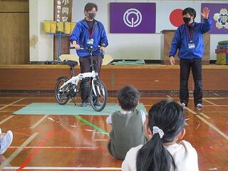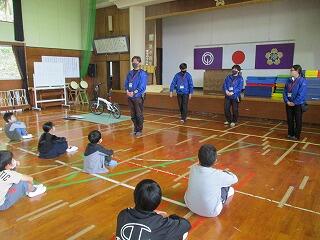 今日、交通安全教室が行われました。旭興自動車学校の4名の先生方が、講師として指導してくださいました。運動場が湿っていたため、体育館で行いました。自転車の点検の仕方や、仕切りのあるところから横断する際の注意の向け方等を具体的に教えていただきました。6年の中西琥鉄君がお礼の言葉を述べました。