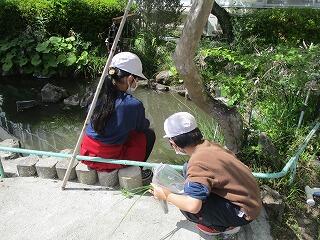 そして、池の卵をのぞくと何かさかんにニョロニョロしています。写真では分かりづらいのですが、オタマジャクシがたくさんかえっていました。これから池が様々な生き物でまた賑やかになりそうです。