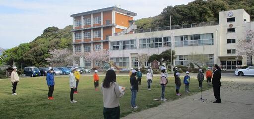 新型コロナウイルス感染症対応のため、場所を運動場に変更して、マスク着用の上、間を空けて整列しました。