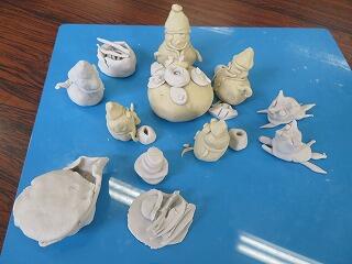 臨時休業中ですが、1年のYさんは毎日のように学校に来て、休業中の課題などをがんばっています。この間の図工の時間から、粘土で「雪だるまの家族」づくりに細かいところまで丁寧に取り組んでいます。やがて家族に、イヌやネコのペットが加わり、ごちそうも並び、だんだん賑やかになってきました。作りながらどんどんお話もふくらみ、楽しそうです。休業中にこんな作品に取り組んでみると想像力も豊かになりそうですね。雪だるまの家族もお話をしているようです。