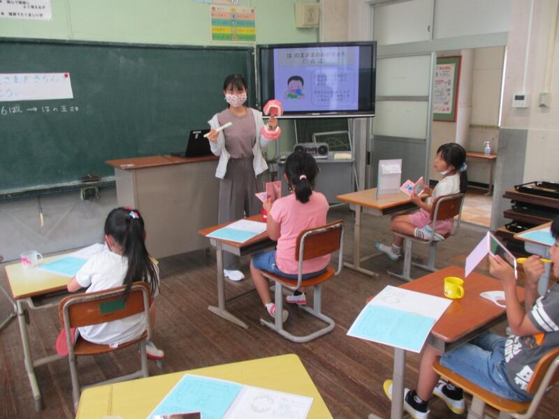 6月4日、今日は虫歯予防デー、1・2年生は、保健室の大浦先生から、実際に歯ブラシやコップを使って、正しい歯の磨き方を教えてもらいました。