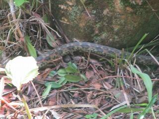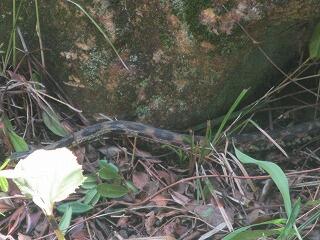 おととい校内の池に近づくと、ヘビが・・・。「ヤマカガシだ。」と思い、写真を撮りました。実は2週間前にも別の池で見かけ、「あの黒とだいだい色の模様のヘビは昔見た覚えがあるけれど何というヘビだろう。」と思い、図鑑やインターネットで調べました。するとヤマカガシという名前でした。ただし、『マムシの3倍の毒をもつ。』と書いてありビックリ。違うヘビじゃないかと調べたところ、やっぱり同じヘビのようです。九州本土で見られるヘビは8種類しかなく、しかも普通によく見かけるヘビは4種類のようです。アオダイショウ、シマヘビ、マムシ、ヤマカガシ、確かにどれも見た事があります。その中で、毒があるのがマムシとヤマカガシだそうです。アオダイショウやシマヘビは子供の時は大人のヘビと模様が違い、マムシに間違われやすいそうです。ただし『ヤマカガシは臆病で人間を見るとすぐに逃げる。ちょっかいを出さなければ噛むことはない。』とあります。最初に見た時、毒があるとも知らず棒で追い払おうとしていたことにゾッとしました。もちろん、子供達にも池近くの藪に近づかないように、ヘビに手を出さないように伝えました。にわか知識ですが、少しヘビのことを勉強できました。池のそばは、カエルも多くなる時期だけにヘビにご注意。ヘビアラート発令と思いました。(2番目の写真は真ん中に目)