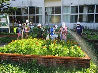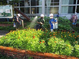 22日(月)カラッとした一日です。朝みんなが登校すると、真っ先に学級花壇に水をあげています。5月28日(木)の花いっぱい活動でみんなが植えたマリーゴールドの苗が、1ヶ月経ち、すくすく伸びて花を咲かせています。