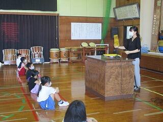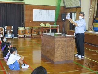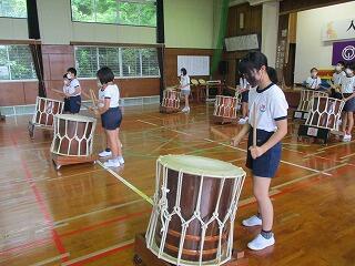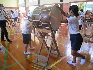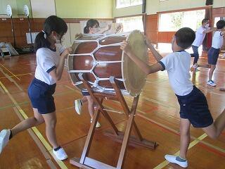 2学期のわんぱく太鼓の練習が始まりました。雲海太鼓代表の平野勝己さん、洋子さんご夫妻が、運動会に向けてばんば踊りの太鼓指導を行ってくださっています。