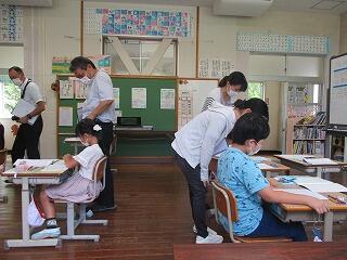 13:30~眼科検診がありました。学校医のタカオ眼科、高尾先生が全校児童を診てくださいました。今日は、結膜炎など目に異常はないかを診ていただきました。普段から目を守るためには、長時間のゲームや携帯使用などにも気をつけたいですね。