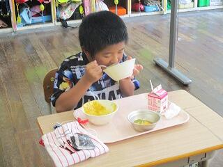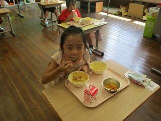 今日の給食は夏野菜カレー。暑い日でも食欲をそそります。写真を撮りに教室をのぞいたら、みんなもう元気に食べ終わった後でした。「おいしかったです。」とのことでした。