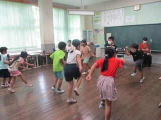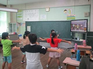 今日下学年みんなで、運動会で踊るダンスの練習をしました。宮崎県に関係がある楽曲を画面に合わせて踊りました。みんなノリノリでした。