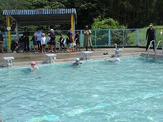 今回は、これまでの練習の成果を発表する記録会を行いました。子どもたちは、それぞれ自分の目標に向けて努力してきました。「いろいろな浮き方ができる」「けのびができる」「バタ足で泳ぐ」「力強くバタ足をする」「クロールの息継ぎができるようになる」「クロールで15m泳ぐ」「クロールで25m泳ぐ」「平泳ぎで50m泳ぐ」等です。記録会では、自分の目標を発表した後、泳ぎました。友達や先生からの応援をもらって、一生懸命泳ぐ姿が見られました。本当に、よくがんばりました。子どもたちの成長ぶりに感動しました!
