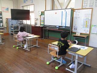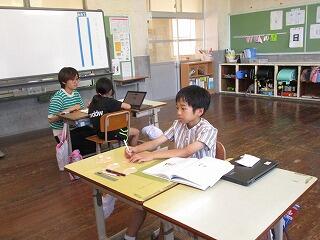 3・4年生の国語です。それぞれの課題に向けて、先生と一緒に、集中して取り組んでいました。