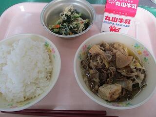 今日の給食は、地元食材黒毛和牛を使った「すきやき風とおひたし」の献立でした。牛肉の甘みを噛みしめながらいただきました。