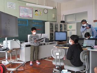 まず、「ズーム」を使って宮崎大学の学生さんと交流を行いました。小規模校の児童同士の授業での交流をイメージすることができました。