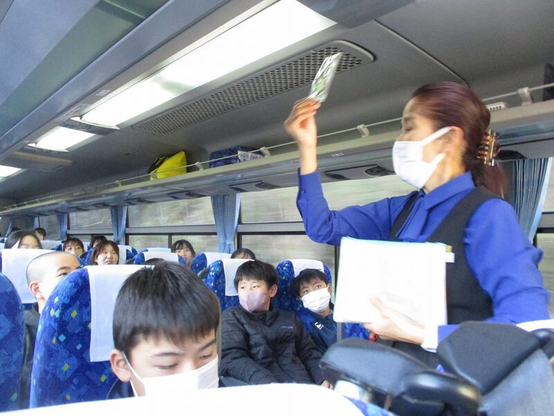 1日目。港小は、川島公園から出発し、蒲江インターパークで結団式をしました。バスの中も、バスガイドさんのお話やゲーム、歌などでにぎやかに過ごしました。