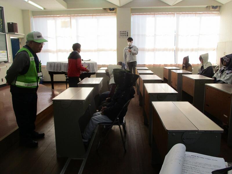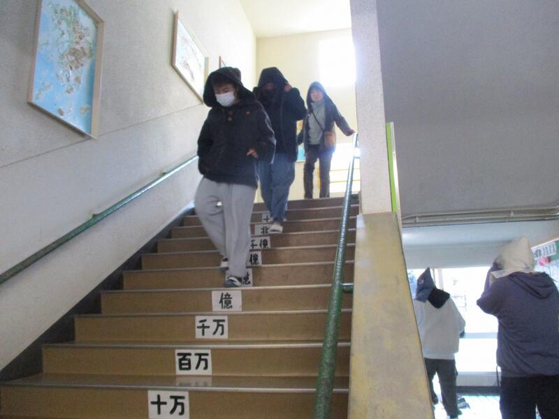 その後、避難訓練を行いました。地震発生後、窓と扉を開け、机の下で身を守る→緊急放送で、運動場に避難をする→津波発生後、特別棟4階音楽室に避難する という流れです。