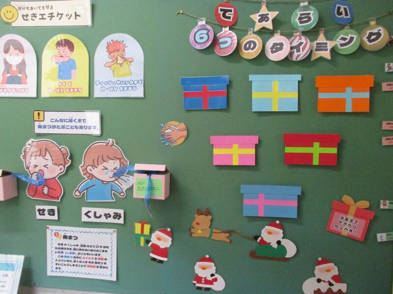 さて、校内の掲示板も新しくなっています。保健室前の掲示板です。手洗い6つのタイミングがプレゼントに隠されています。手洗い、うがい、咳エチケットなどでしっかり予防して、12月も元気に過ごせるとよいです。