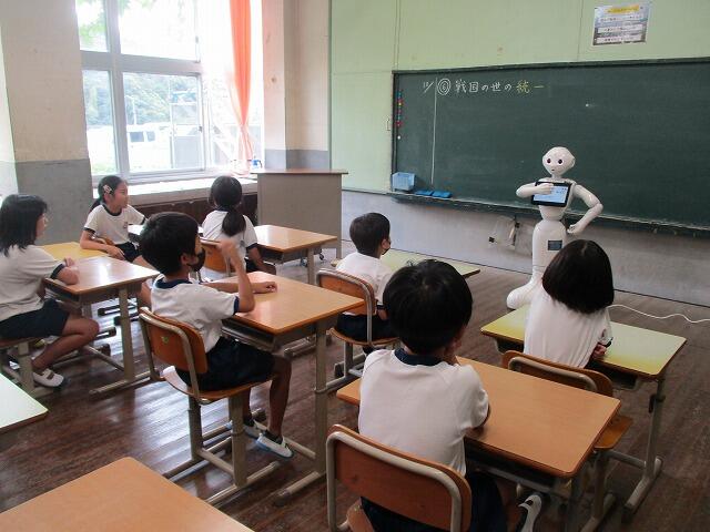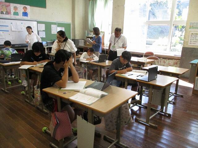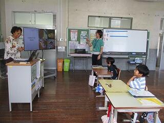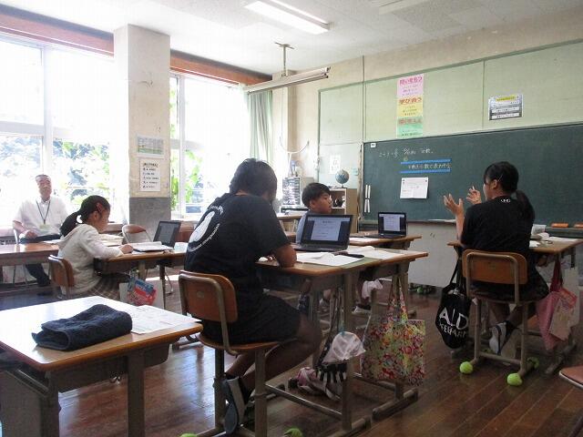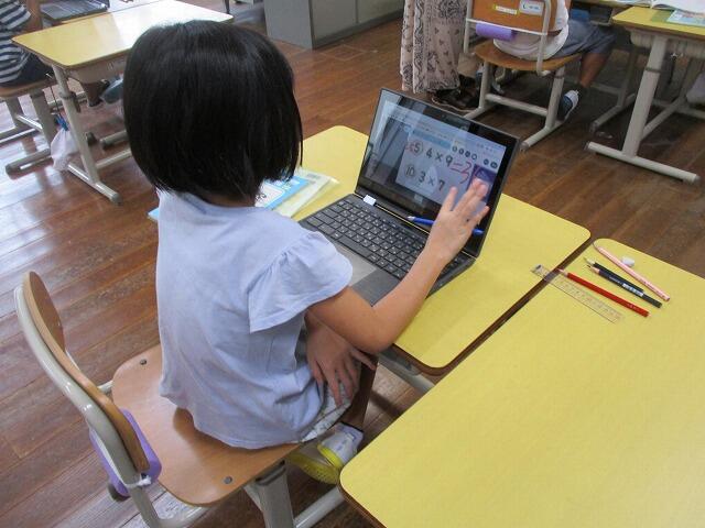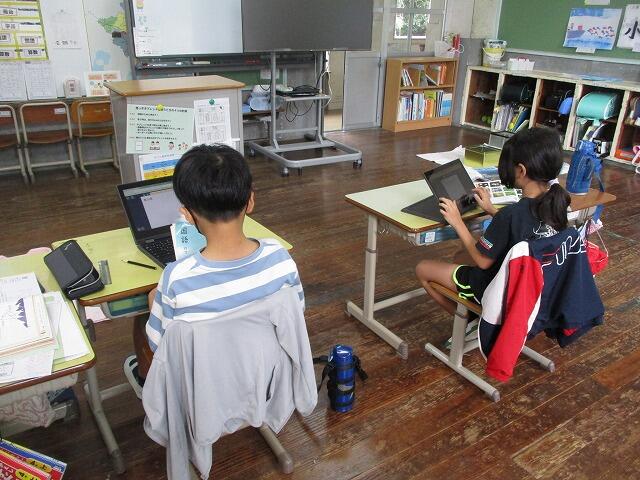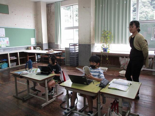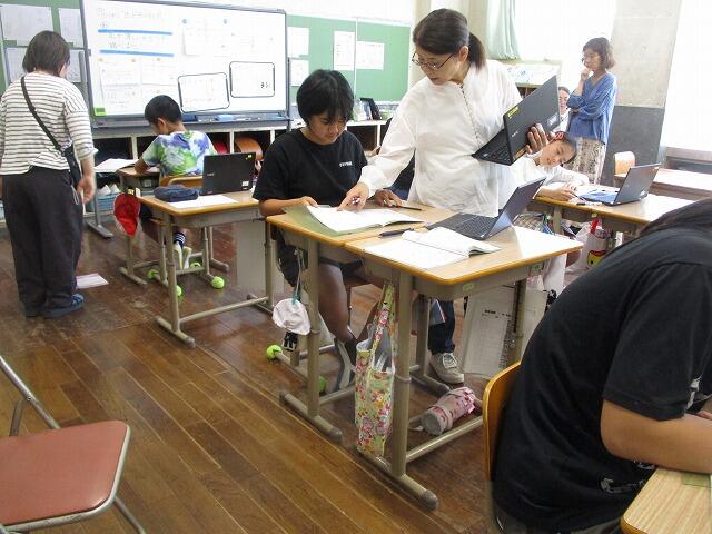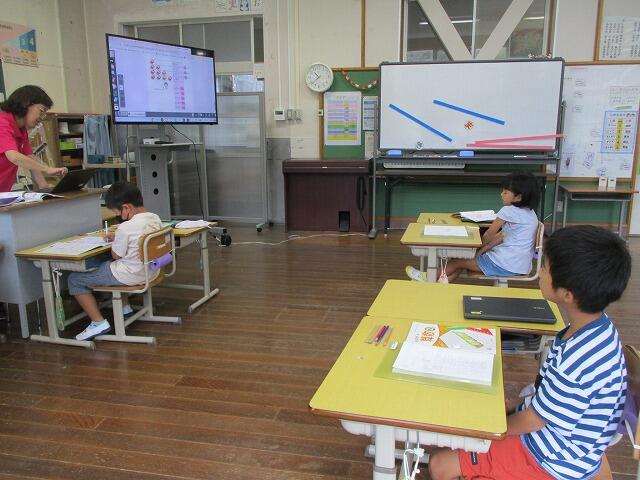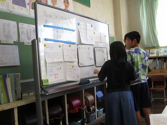 1年生は「大きな数」、2年生は「見方・考え方をふかめよう」の学習でした。3年生は「分数」、4年生は「小数のかけ算とわり算」の学習でした。複式学習ですので、先生がずっとついているわけではありません。自分の考えをしっかりもって発表したり、自分で図をかいて式を立てたりと、子どもたちは、一生懸命考えていました。タブレットも効果的に活用することができていました。先生は、子どもたちに寄り添いながら、時に、子どもたちと対話しながら、学習を進めていました。