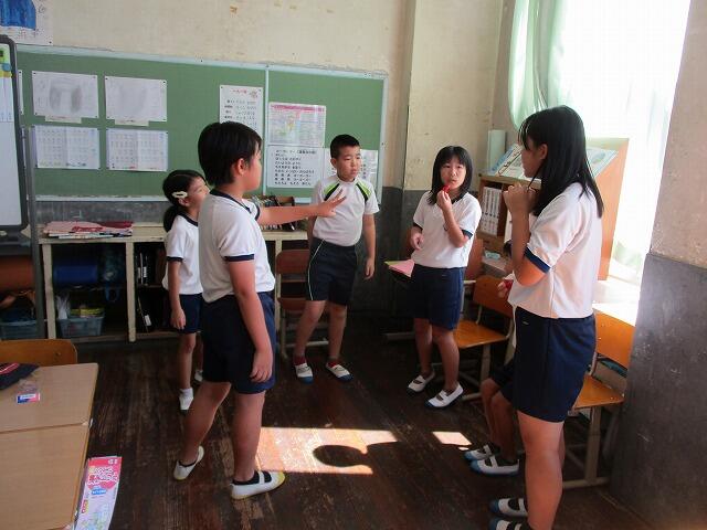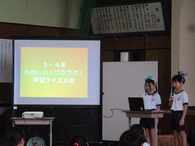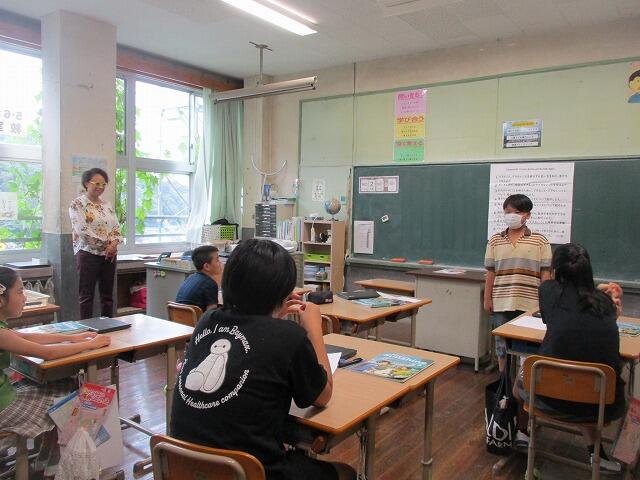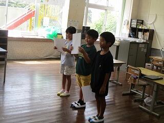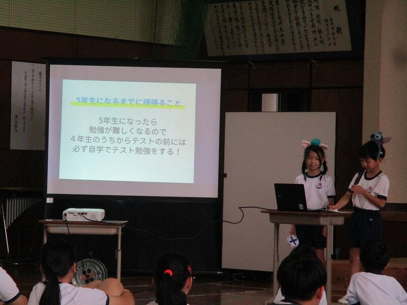 5年生は、単元『I can draw pictures well』で、自分や友達のできることやできないことについて紹介しました。6年生は、単元『My Summer Vacation』で、自分の夏休みの思い出を発表しました。過去形も使って、スピーチしました。子どもたちは、3・4年生のお友達や先生たちを前に緊張気味でしたが、しっかり英語でスピーチをすることができました。子どもたちがたくさん英語をお話ししていたので、聞いているみんなはびっくり感心していました。ぜひ、ご家庭でもスピーチしてもらってくださいね!