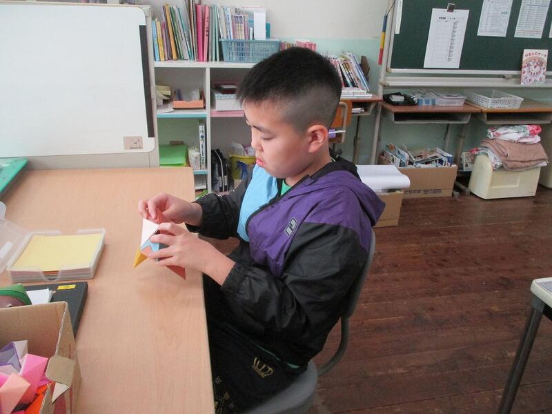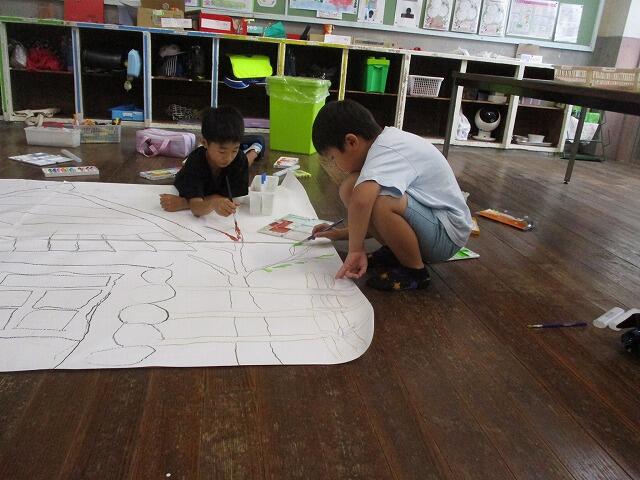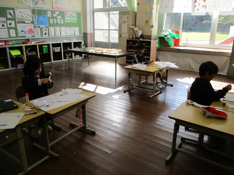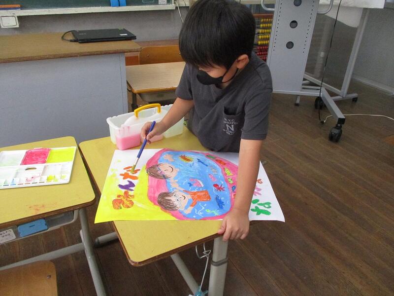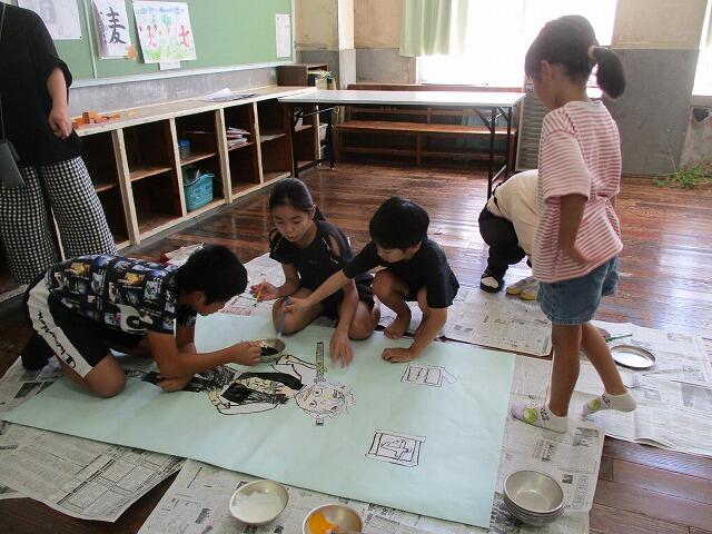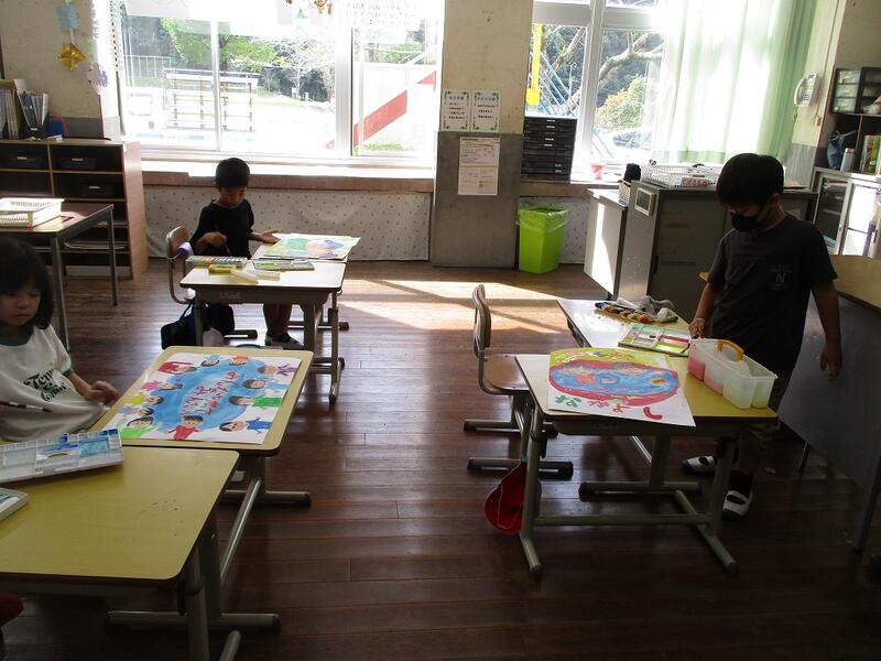 1・2年生は、音読劇で使う背景図の色ぬりをしていました。色を分担して、仲良く色ぬりをすることができていました。自分たちで作った背景図の前で、自信をもって劇の発表ができることでしょう!