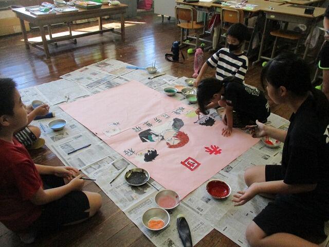 9月13日、合同図工の時間に、運動会の際に飾るそれぞれの団の絵を描きました。子どもたちが、自ら進んで描きたいとのことで、今年度の運動会でも団看板に取り組むことになりました。先週から、どんな絵を描くかを決めて下描きを進めてきました。今日は、それぞれの団に分かれて、全員で協力し合って色塗りをしました。運動会本番に向けて、気持ちも盛り上がってきたことでしょう!