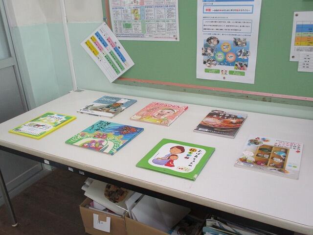 教室に『絵本コーナー』ができていました。思わず手にとって読みたくなる絵本がずらりと並んでいました。すてきな環境です!