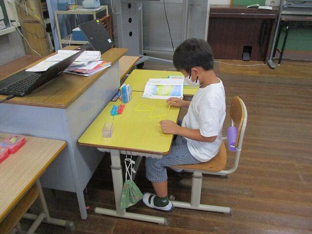 1・2年生の算数です。1年生は、数え棒を使って、いろいろな形づくりに挑戦していました。2年生は、タブレットを活用してかけ算の練習に取り組みました。
