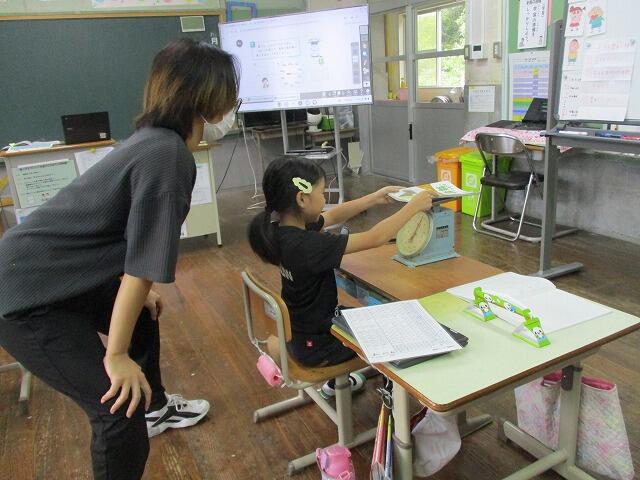 3・4年生の算数です。3年生は、重さの学習、4年生は、□を使った式の学習をしていました。