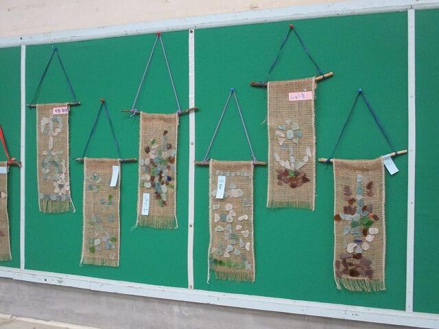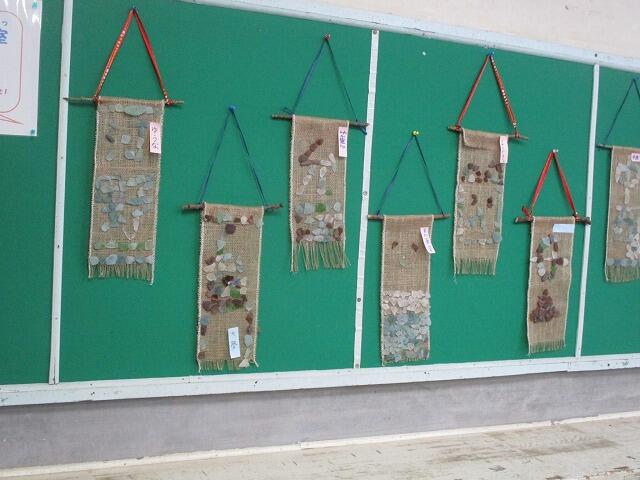 先日、放課後子ども教室で、造形活動がありました。地域の安全管理員さんに、材料を準備していただき、作り方を教えてもらって、おしゃれな「シーグラスを使ったかべかざり」ができました。麻の布に、いろいろな色のシーグラスを、好きな形や模様に貼り付けて仕上げていました。シーグラスは、地域の安全管理員さんが、港地区の海で見つけて集めた物です。多目的室に、展示しています。ぜひ、学校にお越しの際に、ご覧下さいね!