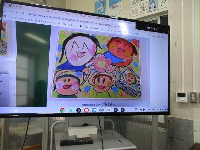 12月20日、2年生が国語の時間、オンラインで交流学習をしました。浦城小のお友達1名と島野浦学園のお友達1名、港小のお友達2名、計4名で行いました。学習内容は、『おもちゃの作り方』の発表会、『そうだんにのってください』の話し合いです。いつも以上に、はりきって発表することができていました。