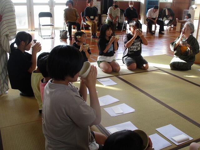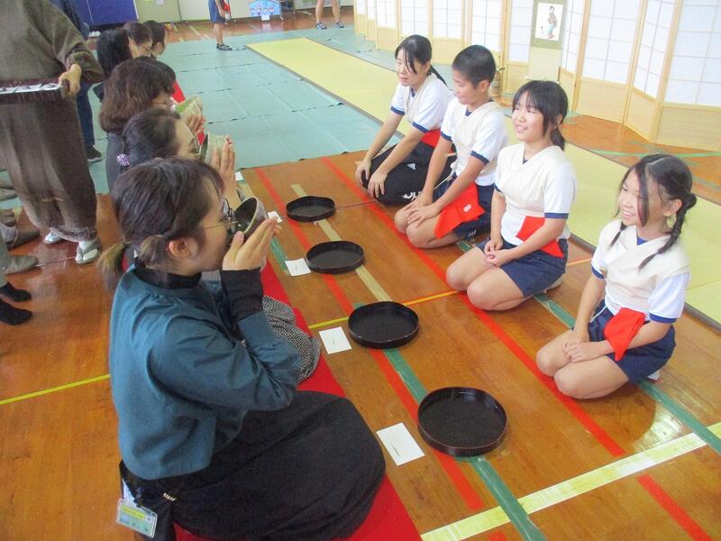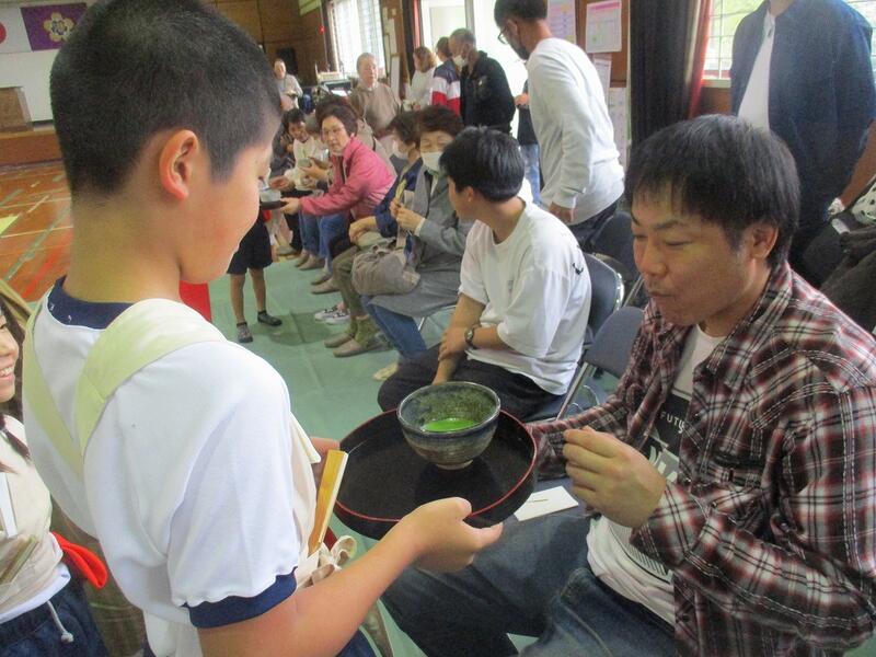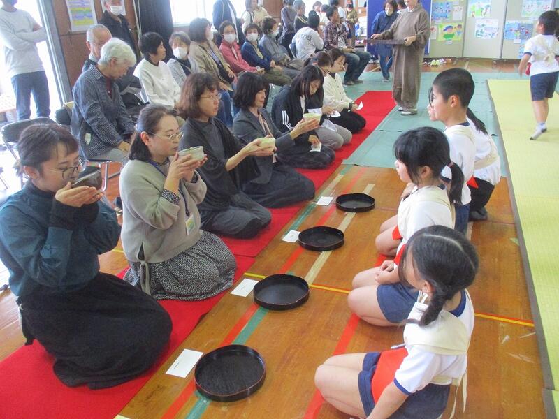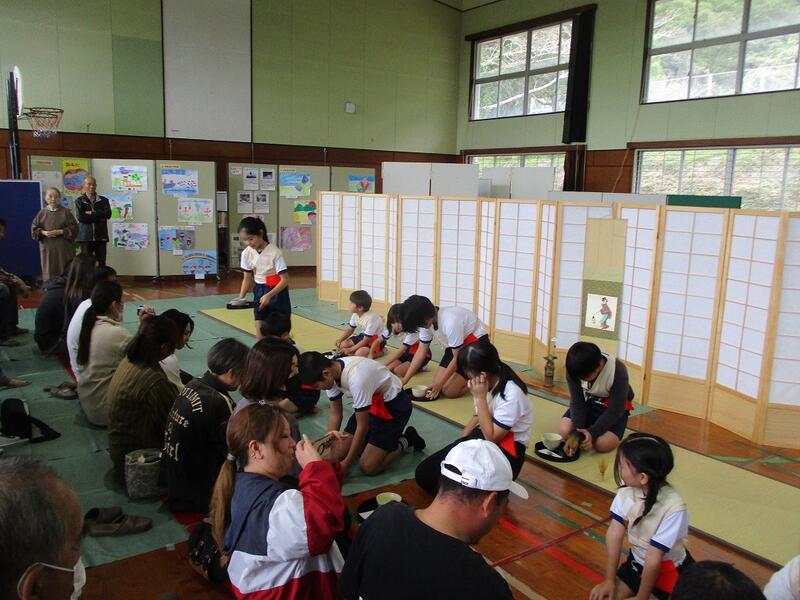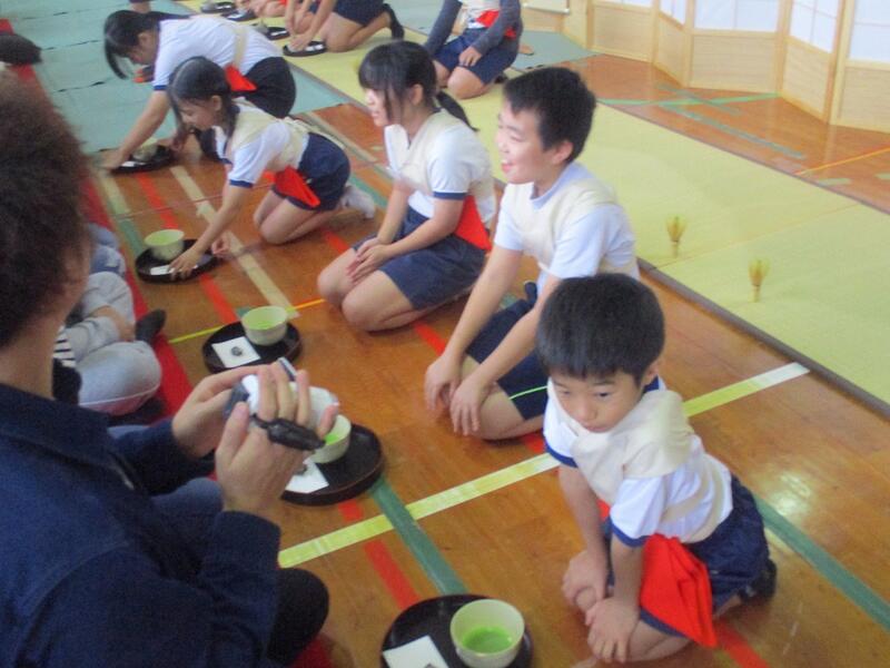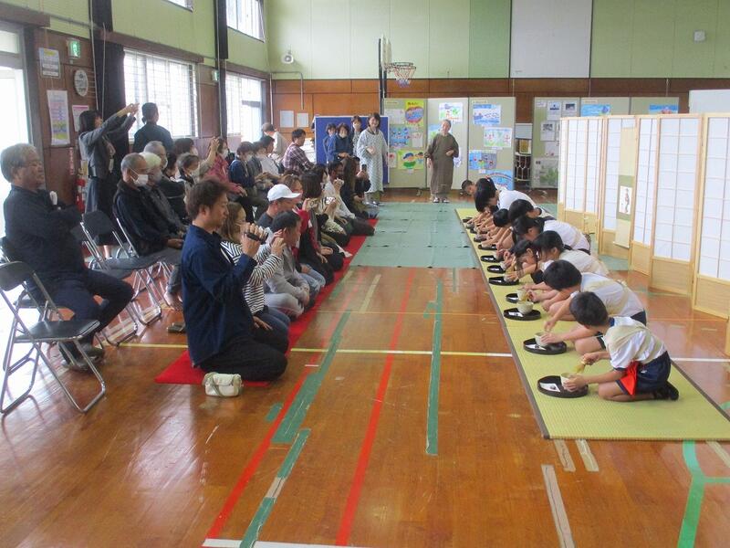 昨日、10月9日、放課後子ども教室で、茶道の先生を招いて茶道教室がありました。体育館に畳や掛け軸、生け花などを準備して、本格的にお作法を学び、お茶をいただいていました。子どもたちは、学校とはまたひと味違う一面を見せていました。正座をして、お茶碗を両手で持ち、丁寧にお茶をいただく姿は、とてもステキでした。正座が大変だったり、抹茶がちょっと苦手だったりする子どもたちも、最後までがんばって礼儀正しく活動しており、感心しました。