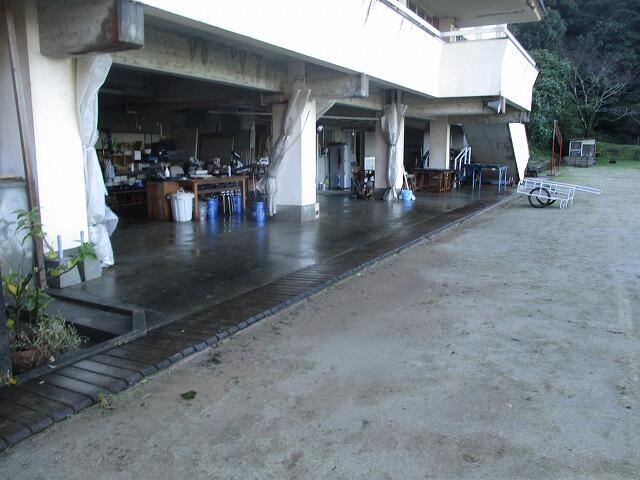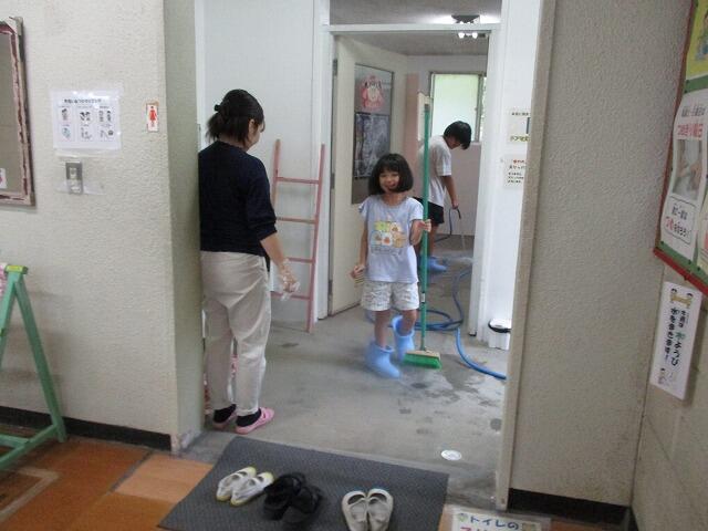 学校は、校舎周辺に土砂が堆積したり、体育館下が浸水したり、教室の雨漏りがあったり(防水工事施工中です)という状況でした。朝、できる範囲で作業をしたところです。また、校舎裏の砂防ダムからの水の勢いもすごかったです。